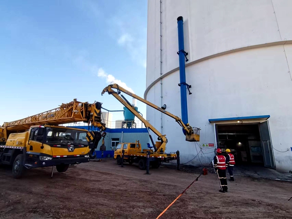 此次技术改造严格对标环保规范及检修作业标准,采用“预制+吊装”高效施工方案。技术团队依据现场测绘数据,在筒仓周边作业区完成新增管道预制加工,确保构件精度与质量可控,精准定位,完成筒仓外壁固定板的安装,提升管道稳定性。随后,通过吊车协同完成新旧两段管道的对接焊接,最后加固焊接支撑确保结构稳固。针对粉尘污染及天气影响等痛点,检修团队为管道排放口定制加装防尘导向弯头,有效解决粉尘排放污染筒壁问题,降低清扫维护频率,规避雨雪天气对现场设备运行的干扰。