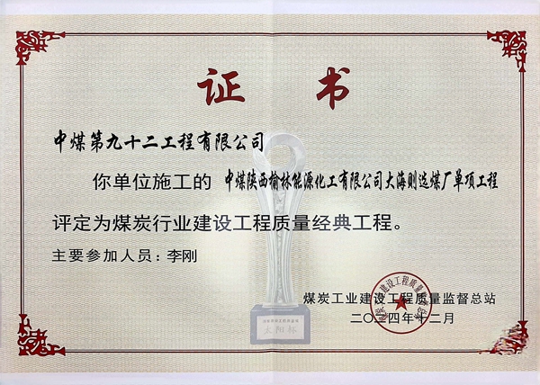 近日,公司大海则选煤厂单项工程被评定为“煤炭行业建设工程质量经典工程”,标志着该项目从市级优质工程迈向行业标杆行列。