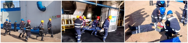 演练模拟场景为机修人员在2#分流仓开展护网焊接检修作业时,因护网倾倒砸中焊机电源线,导致电线绝缘皮破损,内部铜线裸露并与地面残留未清理的积水接触形成导电通路,引发人员“触电”事故。监护人员立即切断总电源,并逐级上报。相关领导接到通知后立即启动《临时用电事故现场处置方案》,应急指挥组立即前往现场统筹调度。各救援小组闻令而动:抢险组设置警示隔离区并检测现场漏电情况,确保作业环境安全;救护组携带救援工具进入现场,转移伤员并进行心肺复苏;保障组负责物资调配与外部协调。整个救援过程响应迅速、分工明确、配合紧密,展现出高效的应急协同能力。演练结束后,现场召开总结会,针对信息传递时效、救援动线优化、医疗处置细节等方面提出改进意见。
